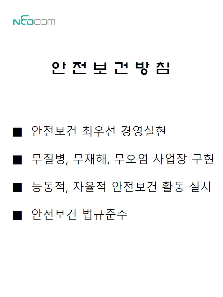 안전한 작업환경과 건강한 근로문화를 조성하여 무재해 사업장을 실현합니다.